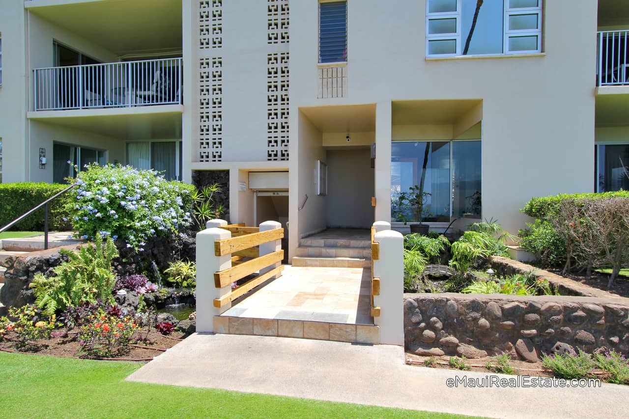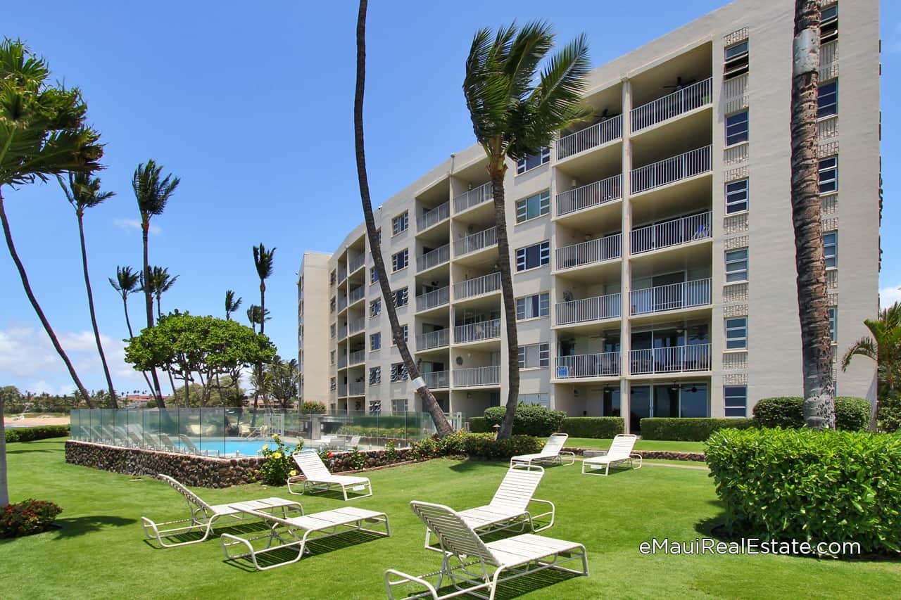 The 6-story building of Royal Mauian is arranged in an arc with each unit having a lanai that faces out toward the ocean. There is a spacious manicured lawn fronting the building offering plenty of room to relax on lounge chairs and bask in the tropical sun. On site amenities include an in-ground pool and a roof-top observation deck with ample outdoor seating and multiple BBQ grills. Some of the nearby highlights include the famous Koiso Sushi Restaurant, Hawaiian Moons heath food store, and the Kamaole Shopping Center which has the recently added Coconut's Fish Cafe.