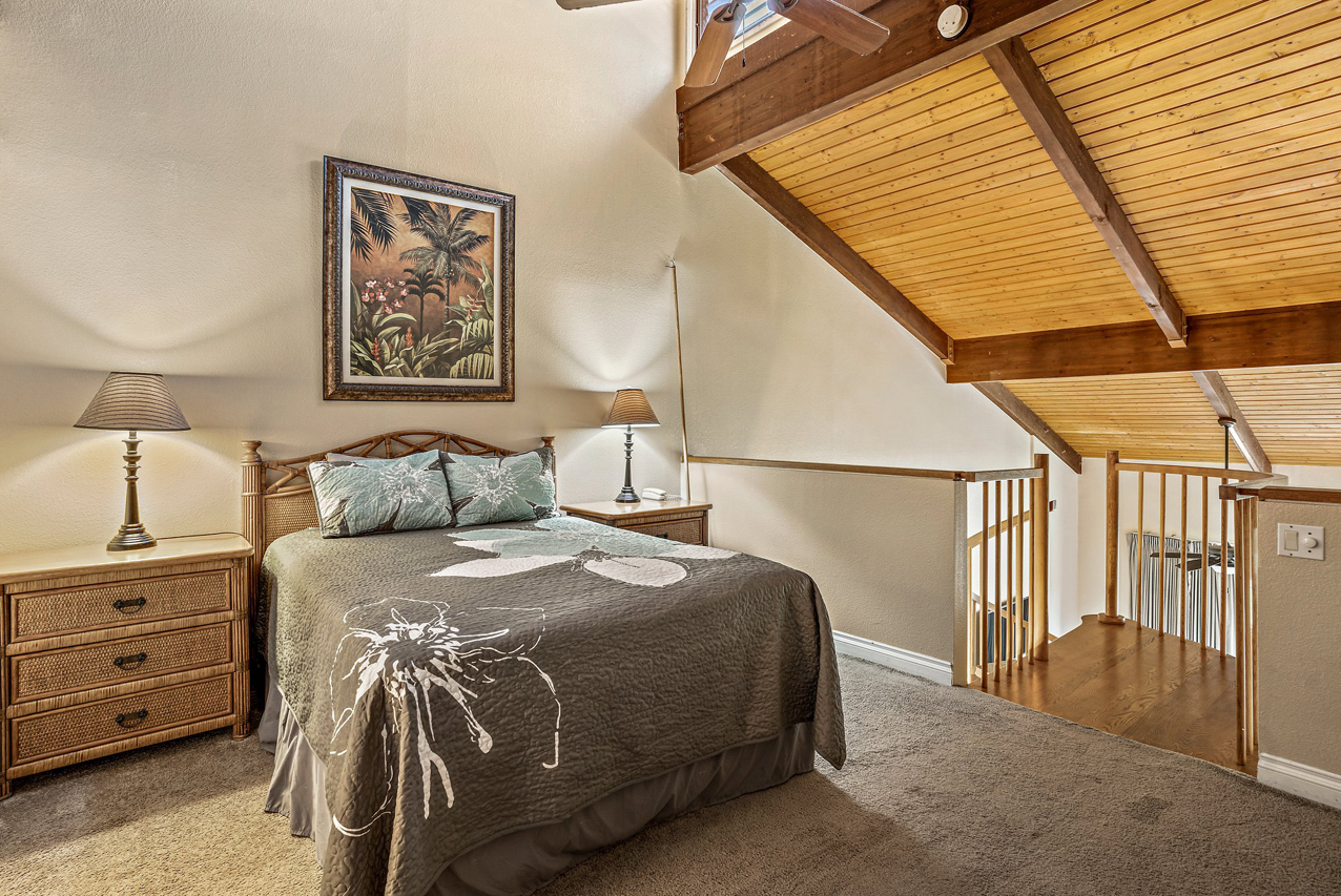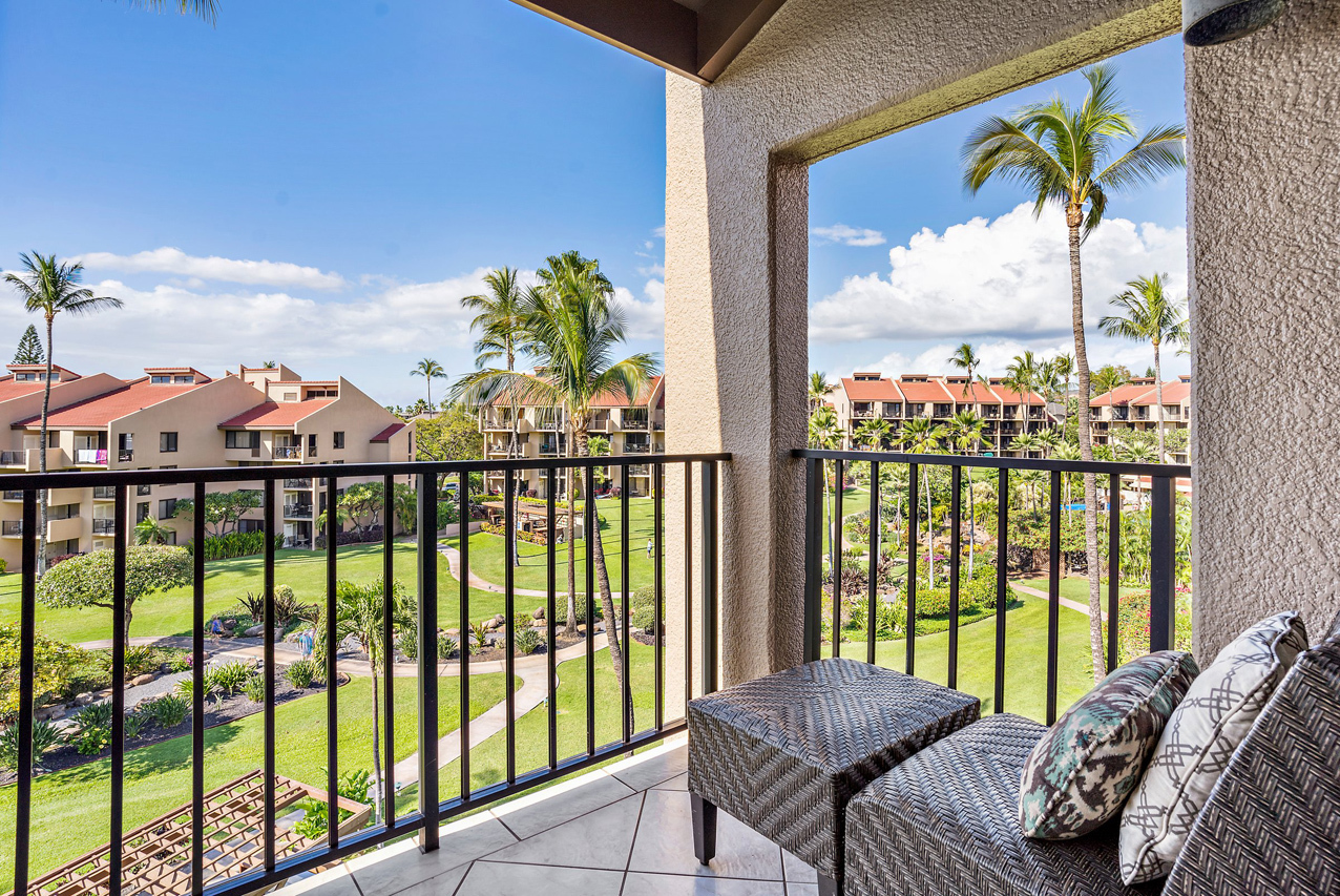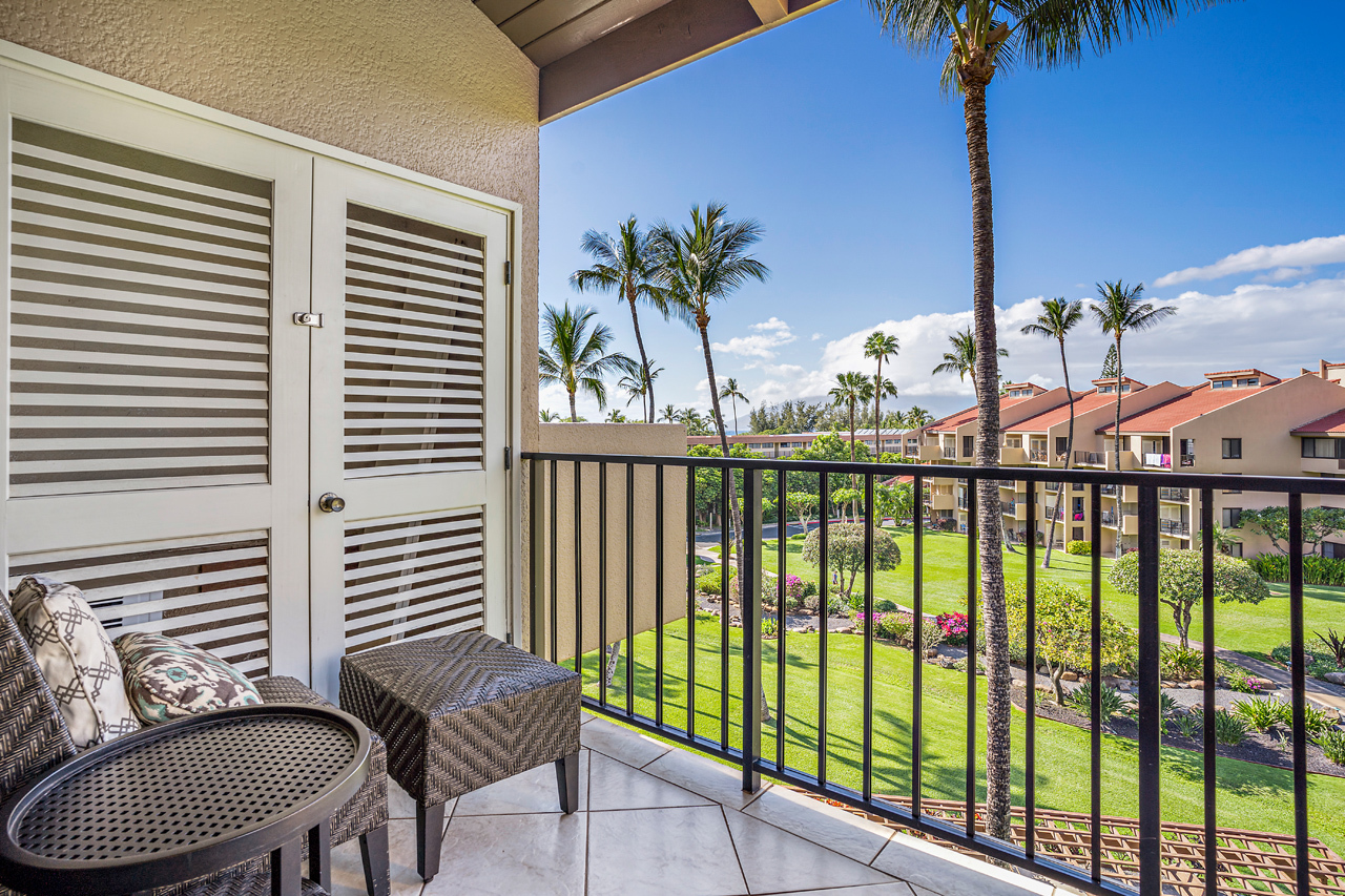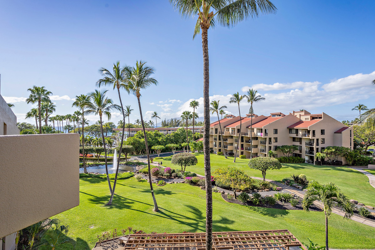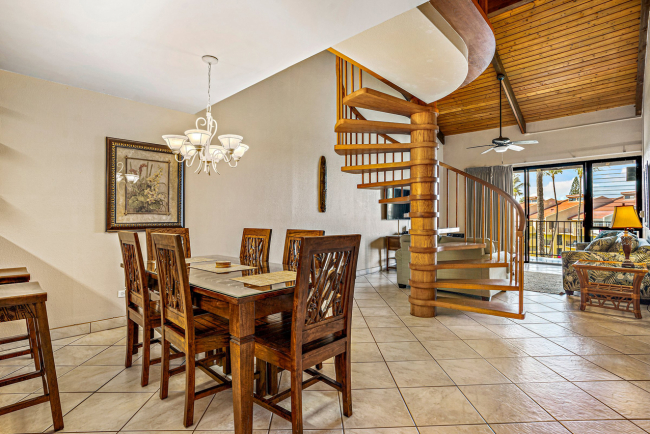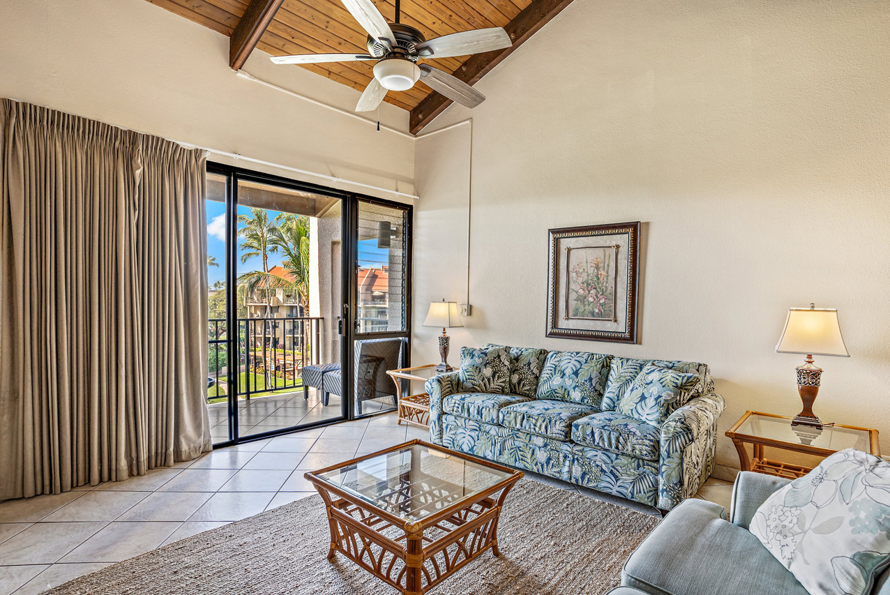 Kamaole Sands 7-402 has everything you're looking for in a Maui vacation condo: Ocean views, 2 bedrooms and 2 full bathrooms, spacious floor plan with high vaulted ceilings, and a great top-floor location! Wonderful presence on the interior courtyard with lush landscaping perfectly framing the ocean views seen from the lanai. Open beam vaulted ceilings with natural wood tones add to the feeling warmth and hospitality. The front entry area, bathrooms, kitchen, and great room areas are completely tiled. There are energy efficient stainless steel appliances and custom Hawaiian style cabinets featured in the kitchen. The home is tropically furnished and offers both indoor and outdoor dining. The architecturally timeless spiral oak staircase leads to the upper level bedroom and ensuite bath. This is a fully furnished, turnkey condominium located across the street from one of Maui's most beautiful sandy beaches, Kamaole III. Close to parks, shops and restaurants, Kamaole Sands is one of the most popular vacation rental complexes in South Maui. Amenities include a beautiful pool, sun decks, 2 large spas, 4 tennis courts, 8 BBQ areas, an activity center, and security. Freshwater ponds and waterfalls add a lush tropical feel to the property. For world class golfing and shopping, you can take a short drive to Wailea. Schedule a private showing today!